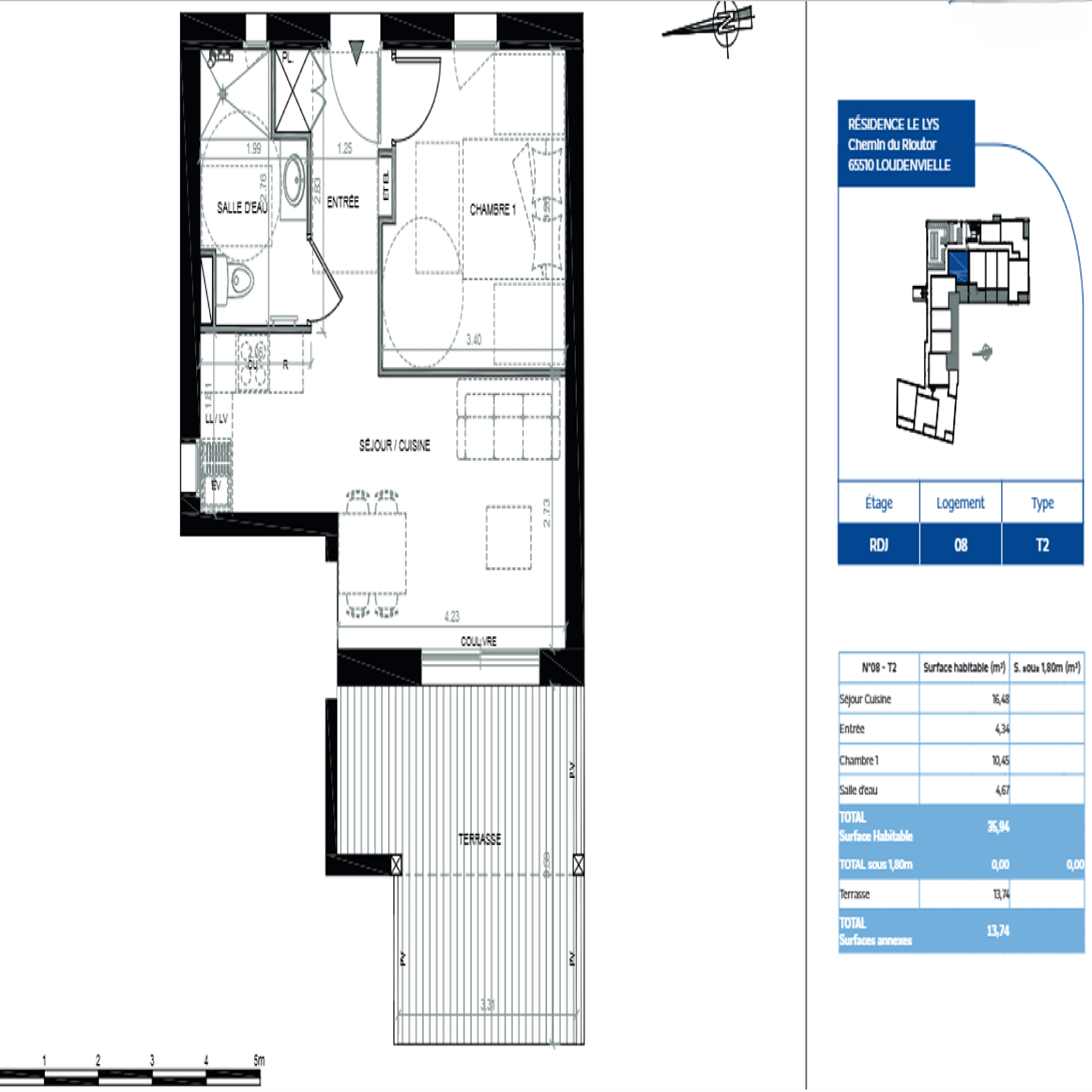 Il se compose d'une pièce de vie (séjour, cuisine) d'environ 16.48m², une chambre d'environ 10.45m², et d'une salle d'eau avec WC.