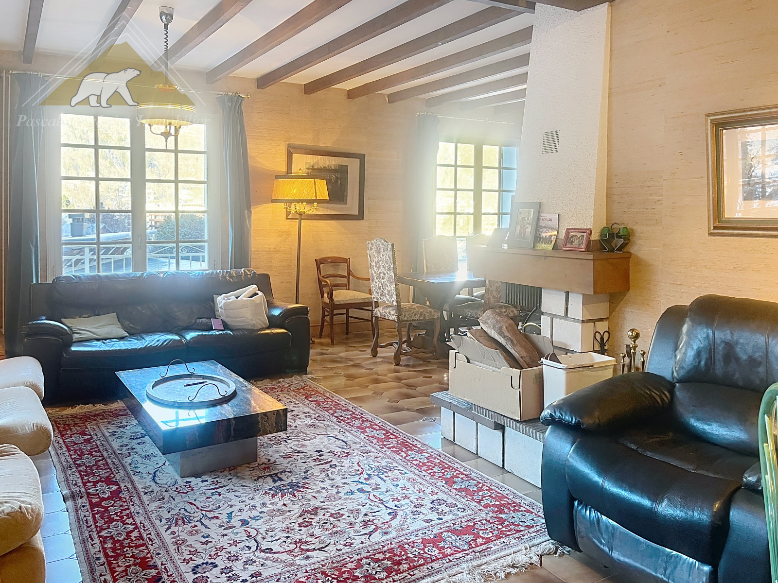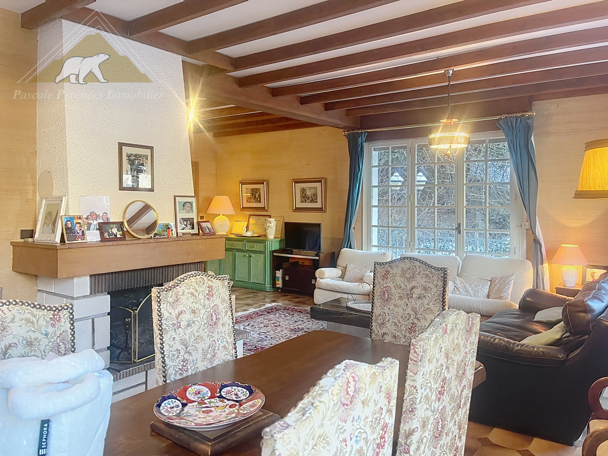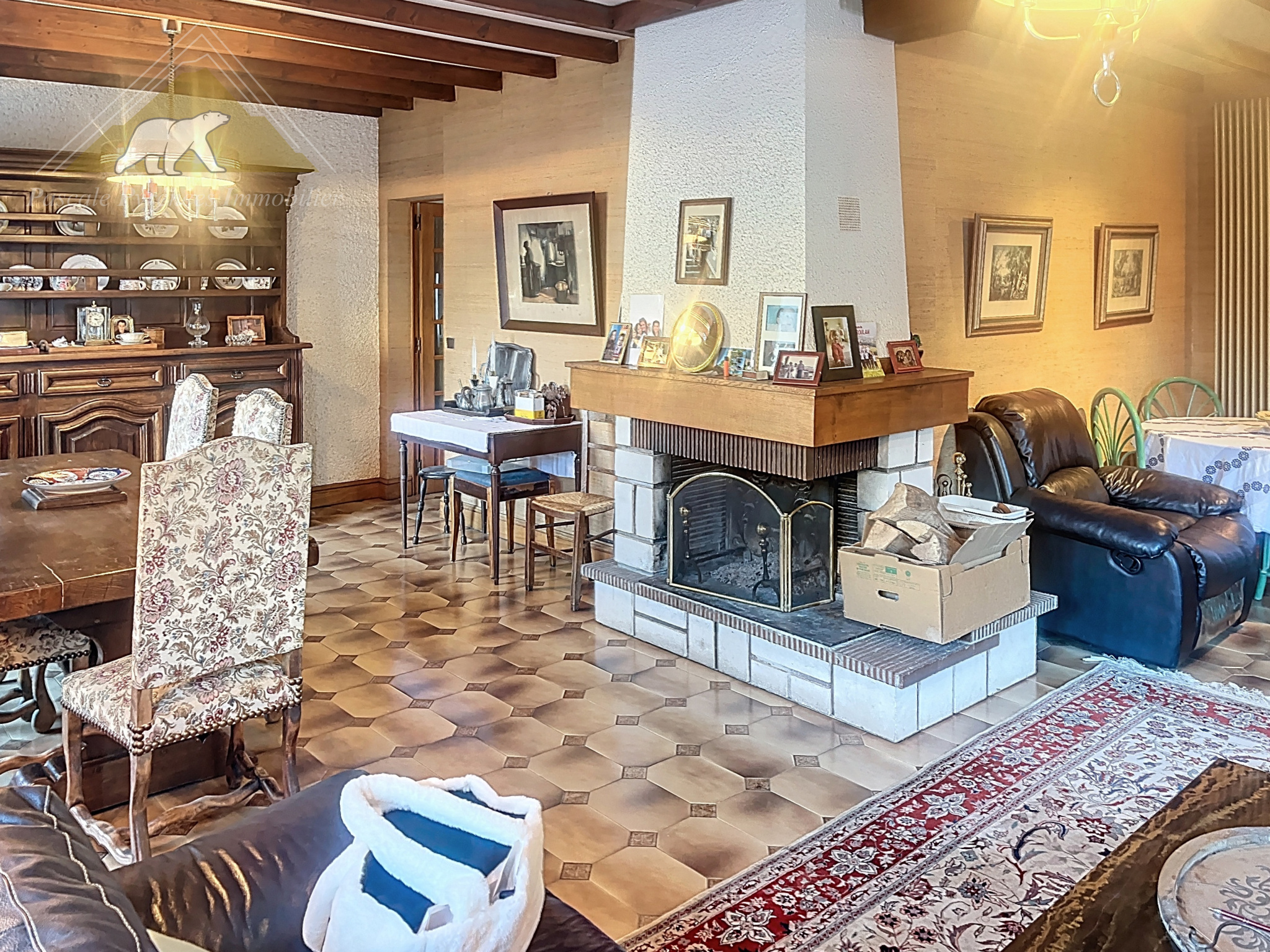 Organisée sur plusieurs niveaux, la maison propose un salon-séjour chaleureux, structuré autour d’une cheminée centrale, véritable cœur de vie.