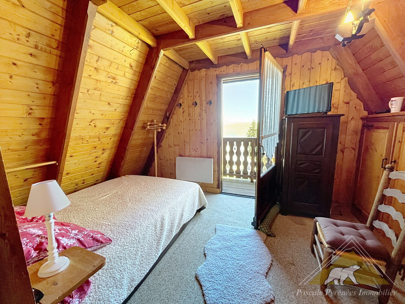 Une pièce de vie accueillante, toute en bois, réchauffée par un poêle, avec salle de bain, WC et un balcon ouvrant sur les montagnes.