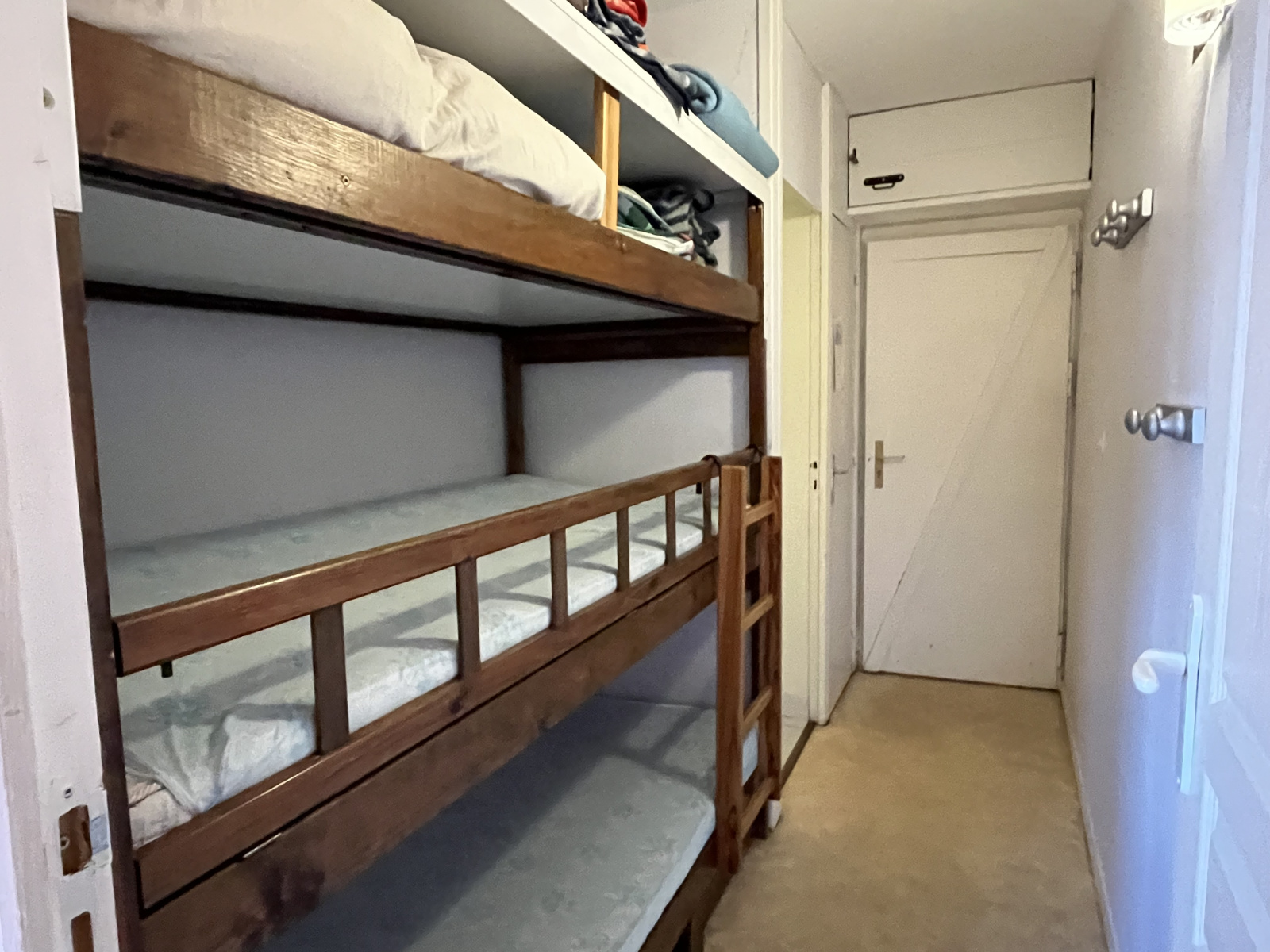 Un coin nuit en alcôve est aménagé pour les enfants et comprend deux lits superposés, créant un espace de couchage fonctionnel et séparé.