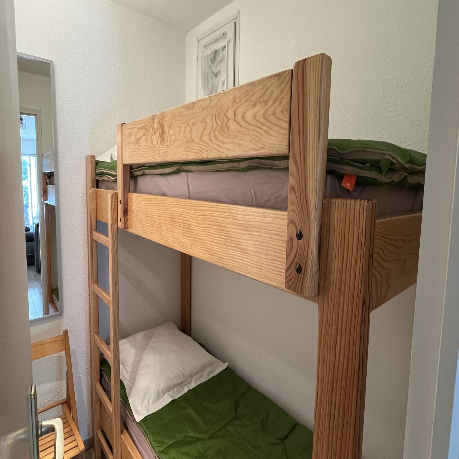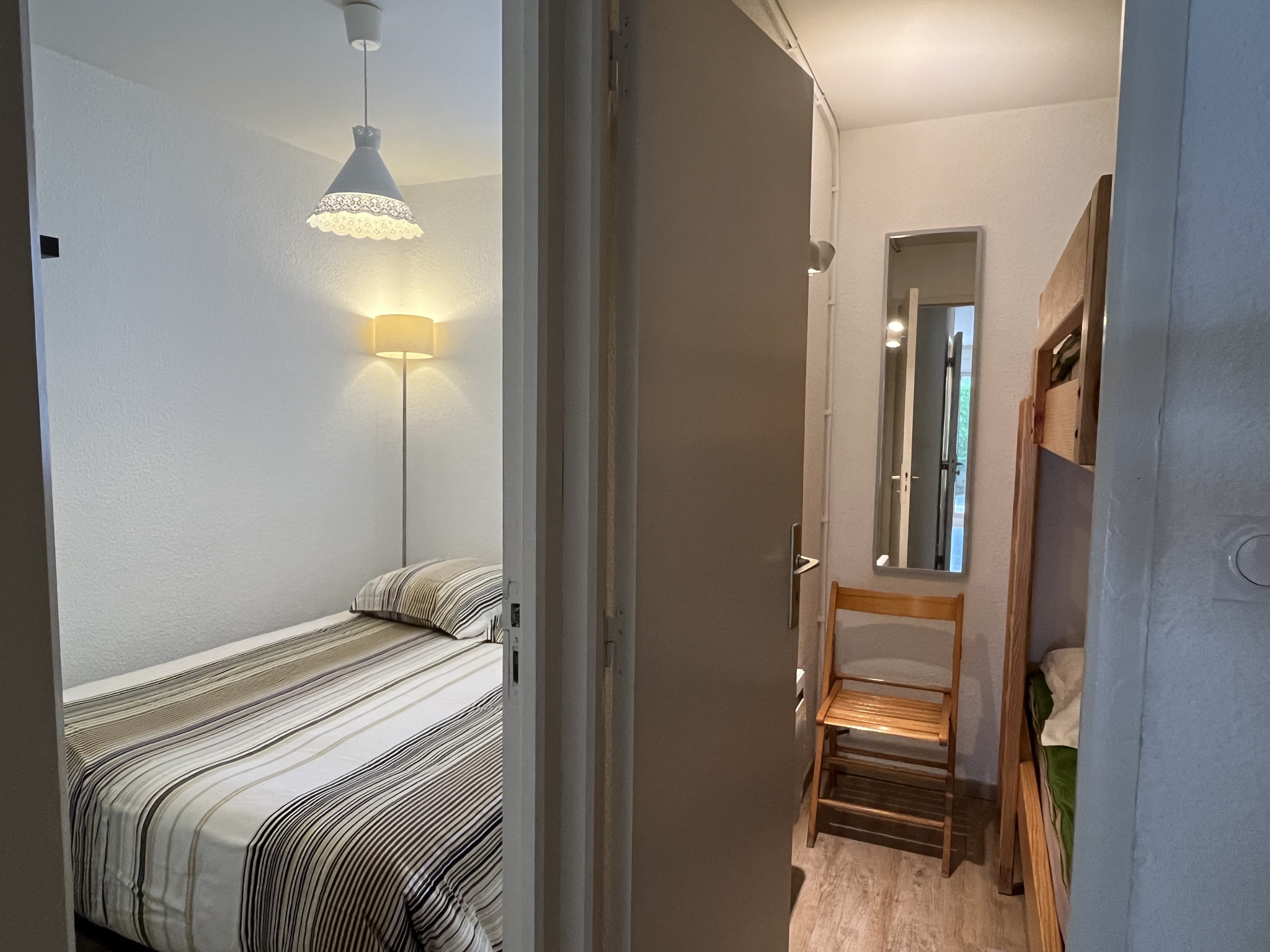 Fonctionnel et en parfait état, il s’ouvre d’abord séjour, baigné de lumière et tourné vers le sud, qui dessert une chambre confortable, dotée d’un lit en 140 et une cabine astucieuse, aménagée avec deux lits superposés, telle une petite alcôve propice aux rêves. ,