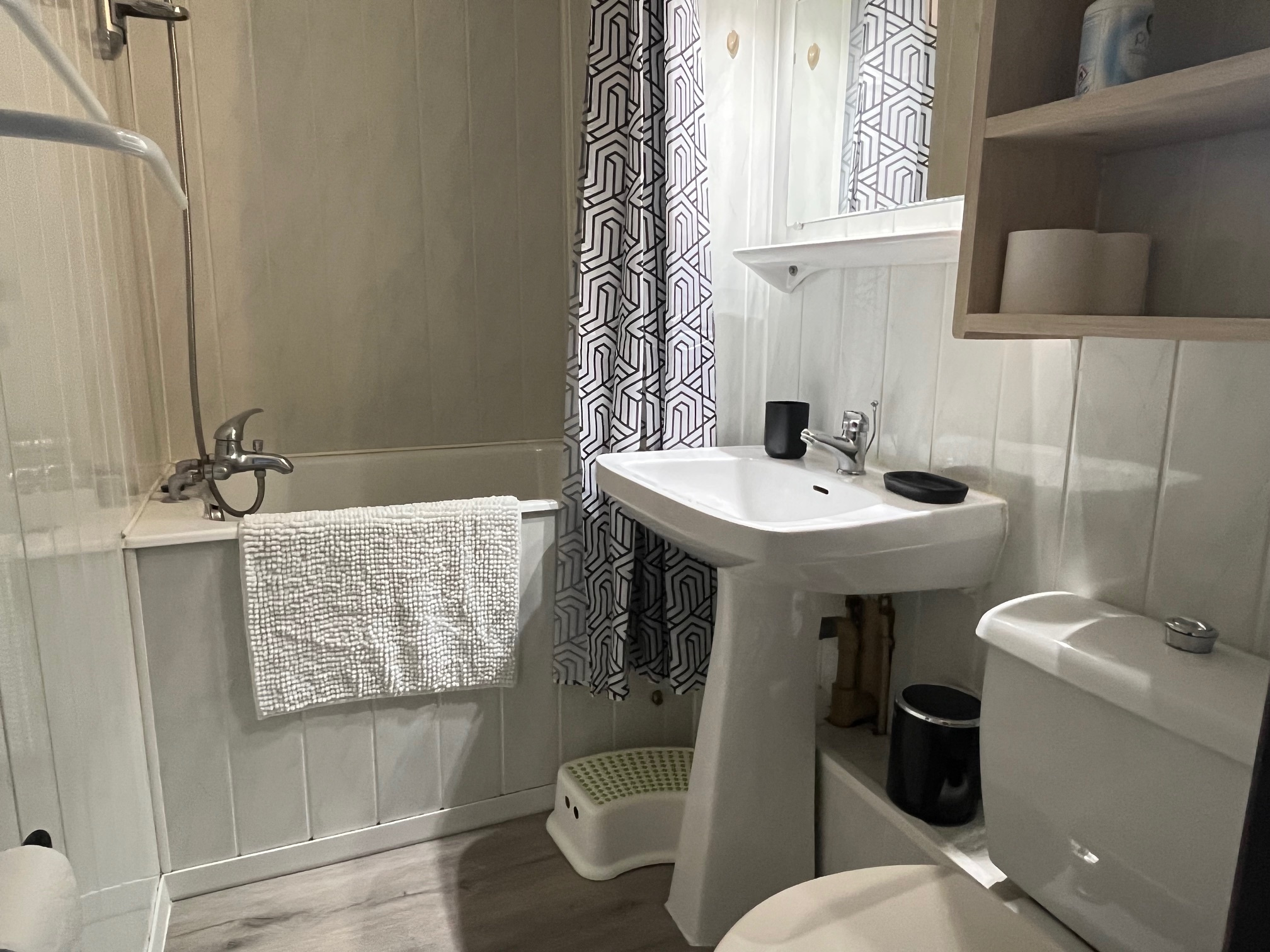 Sa salle d’eau raffinée, repensée avec goût, allie confort et modernité.