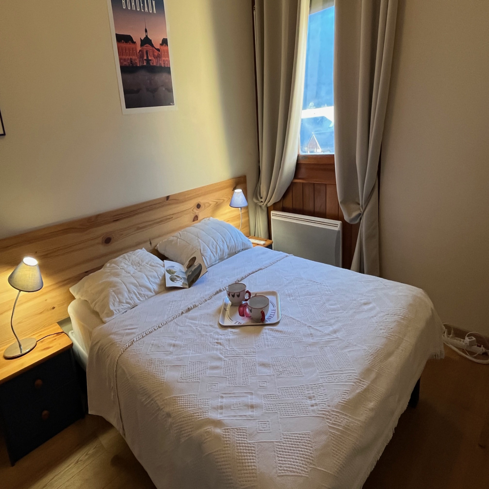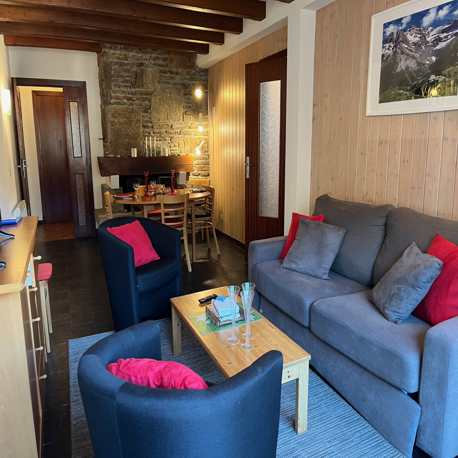 La distribution des espaces a été bien pensée : une pièce de vie conviviale avec cheminée et poutres apparentes, une cuisine séparée entièrement équipée ainsi qu'un espace nuit composé de deux chambres suffisamment spacieuses pour recevoir famille et amis