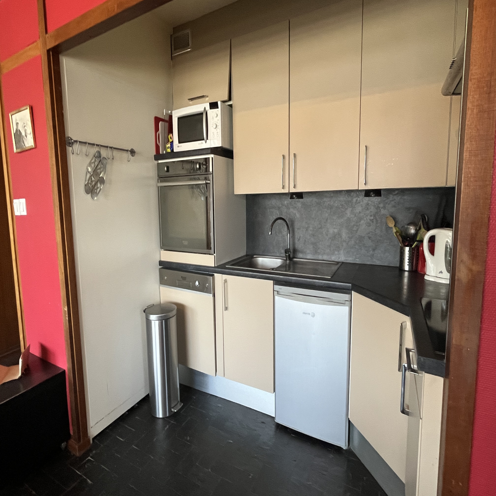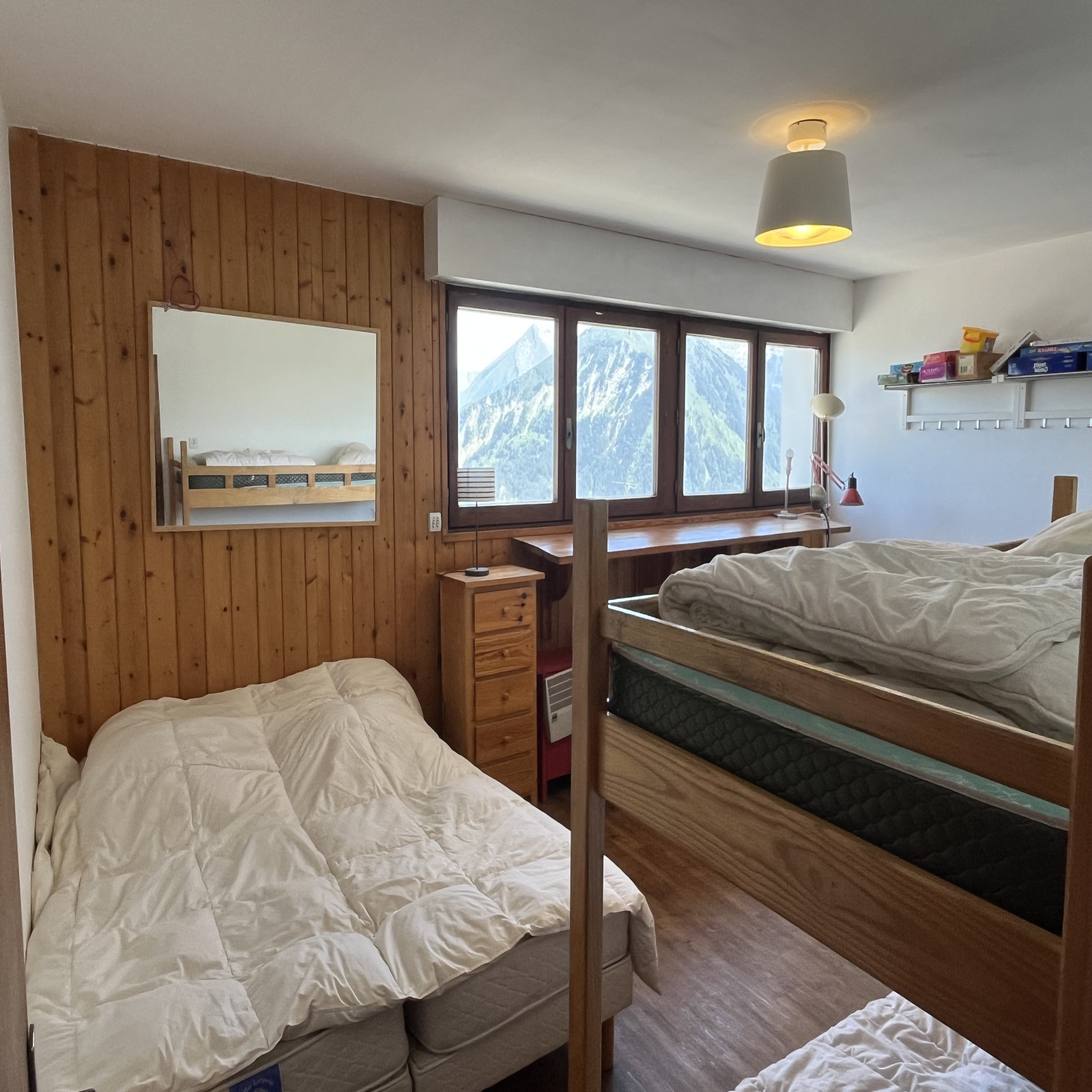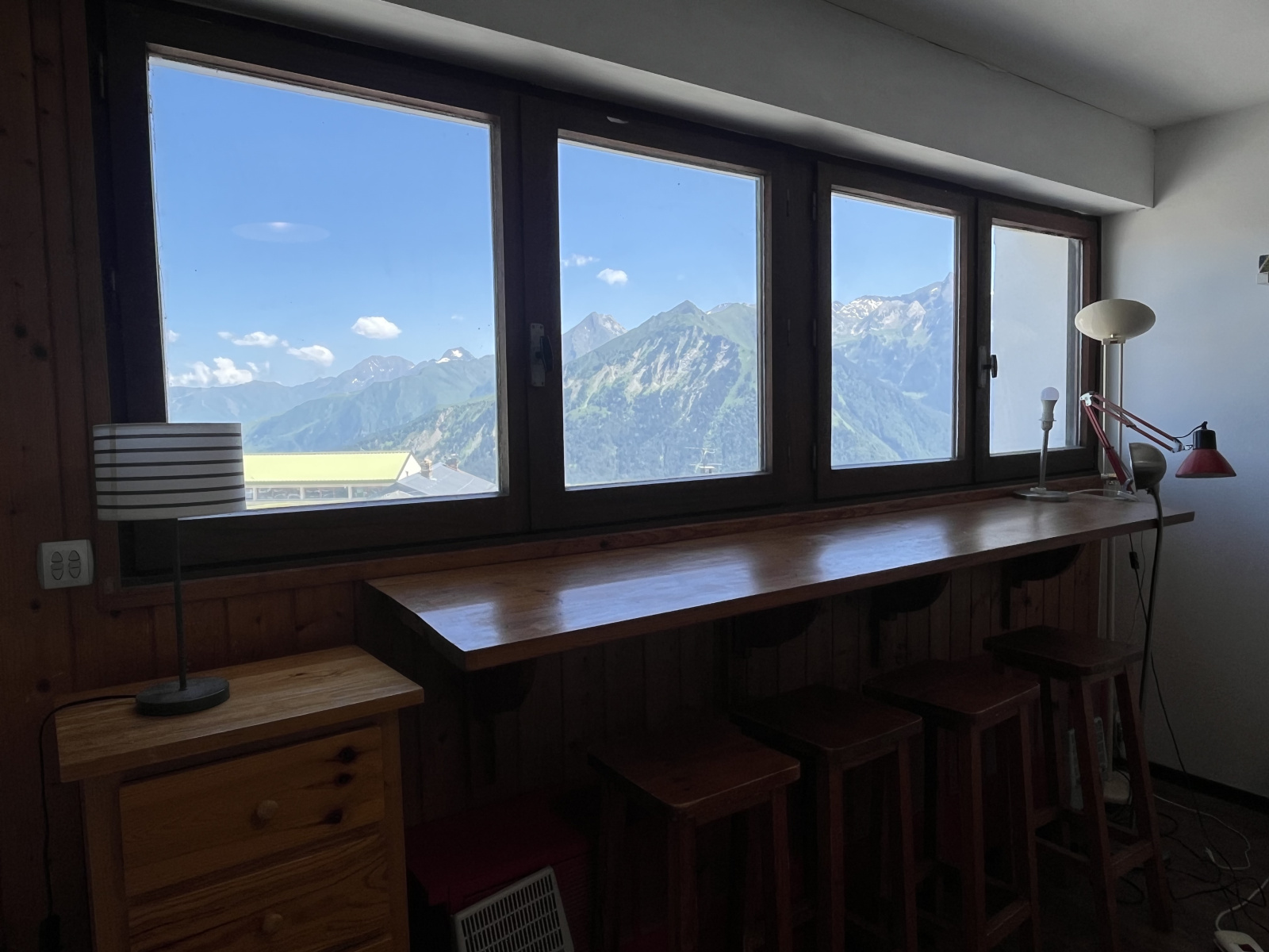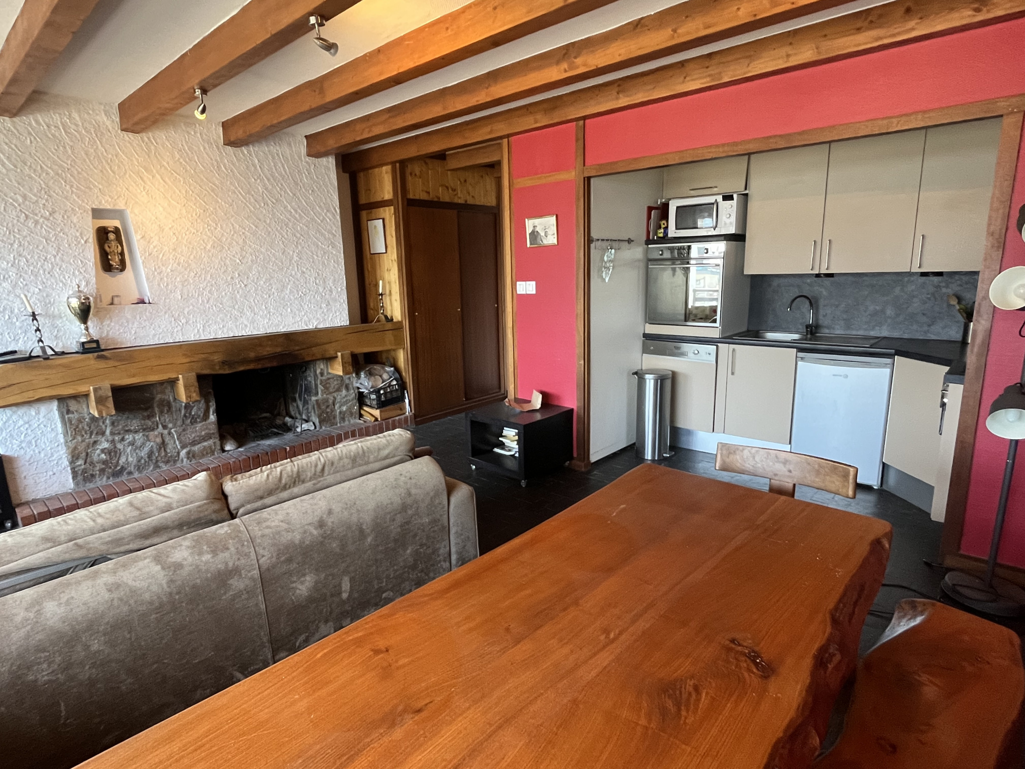 La cuisine, récemment réaménagée, s’intègre harmonieusement à l’espace. Un coin dortoir complète ce niveau, bénéficiant lui aussi d’une vue panoramique sur les montagnes.